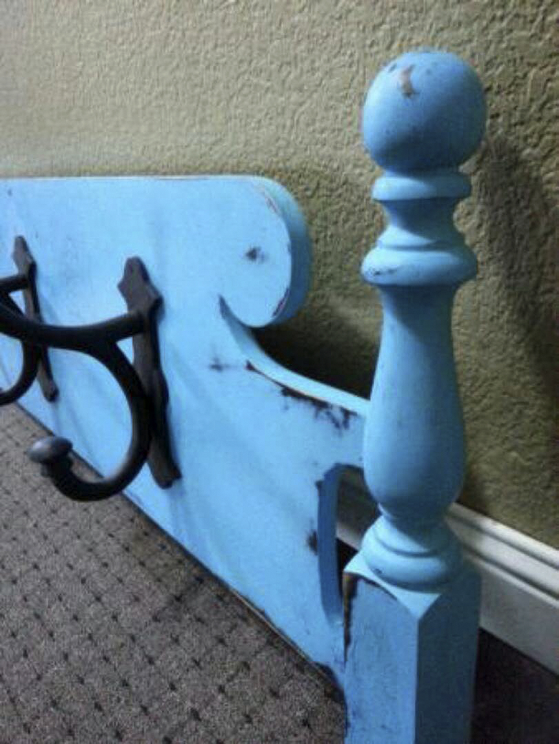 Up-cycled bed foot board to coat rack. http://www.lifeatthecottage.com