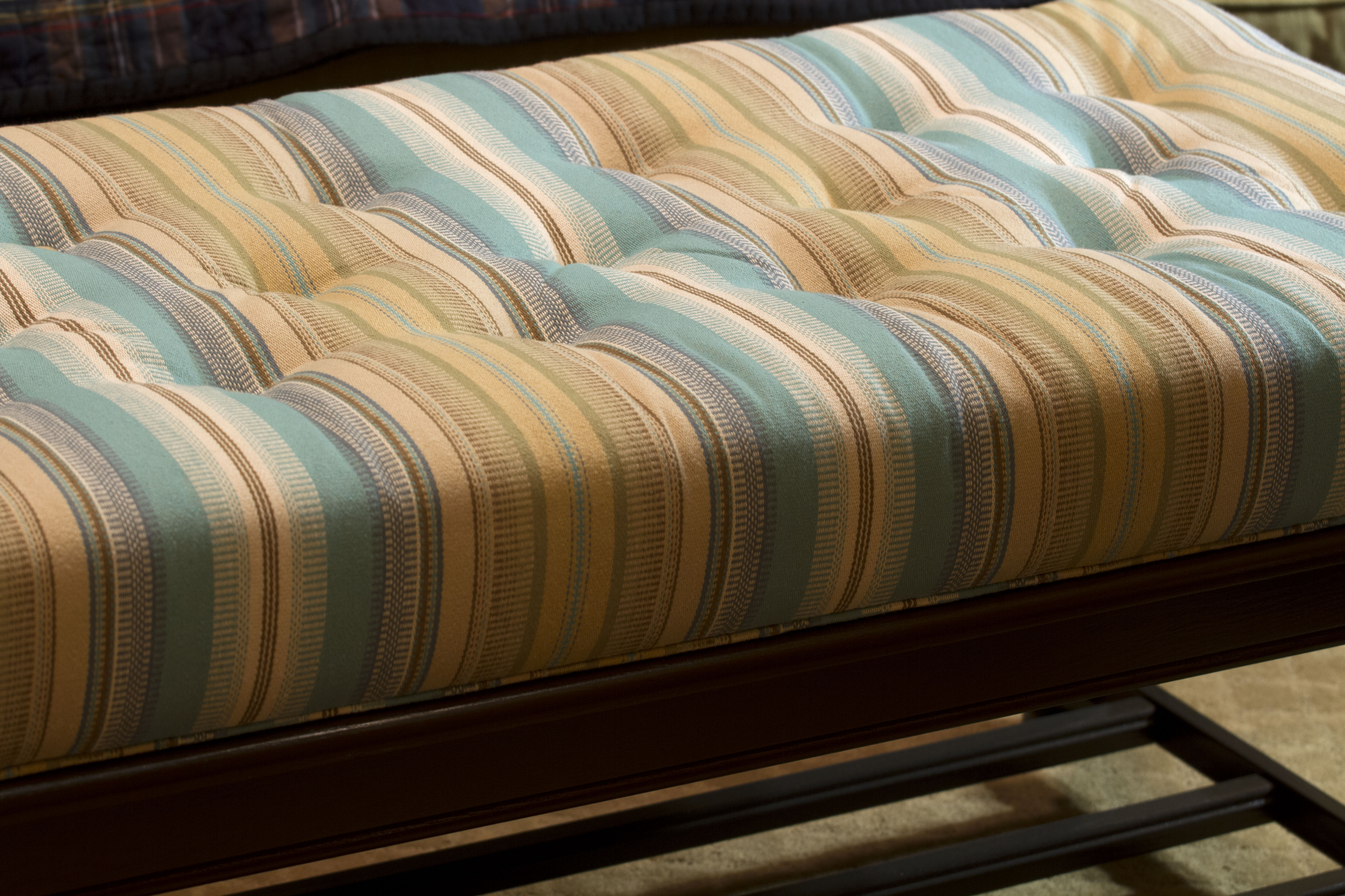 To make the upholstered bench top I measured the top and cut plywood to that measurement. I drilled holes in the plywood in the pattern I chose for the buttons. (Even if you are not tufting your bench, drill a few holes for the air to escape when the foam is compressed when sat upon.) I used a 4 inch piece of foam and wrapped it in batting to soften the edges. Using a remnant found at our local fabric store, I covered the foam. I didn’t have a button press to make the covered buttons and the fabric was thick so I went to an upholstery shop and had the buttons made. After aligning the stripes up and attaching the fabric under the edge of the plywood with staples, I used a long needle to go through the holes I drilled to make tufting in the bench. (There are several products to use for the tufting such as a strong upholstery thread or wire.) I then sewed piping and stapled the piping around the bottom edge of the plywood. Next I positioned the upholstered plywood on top of the coffee table and screwed it on from underneath the top framework.