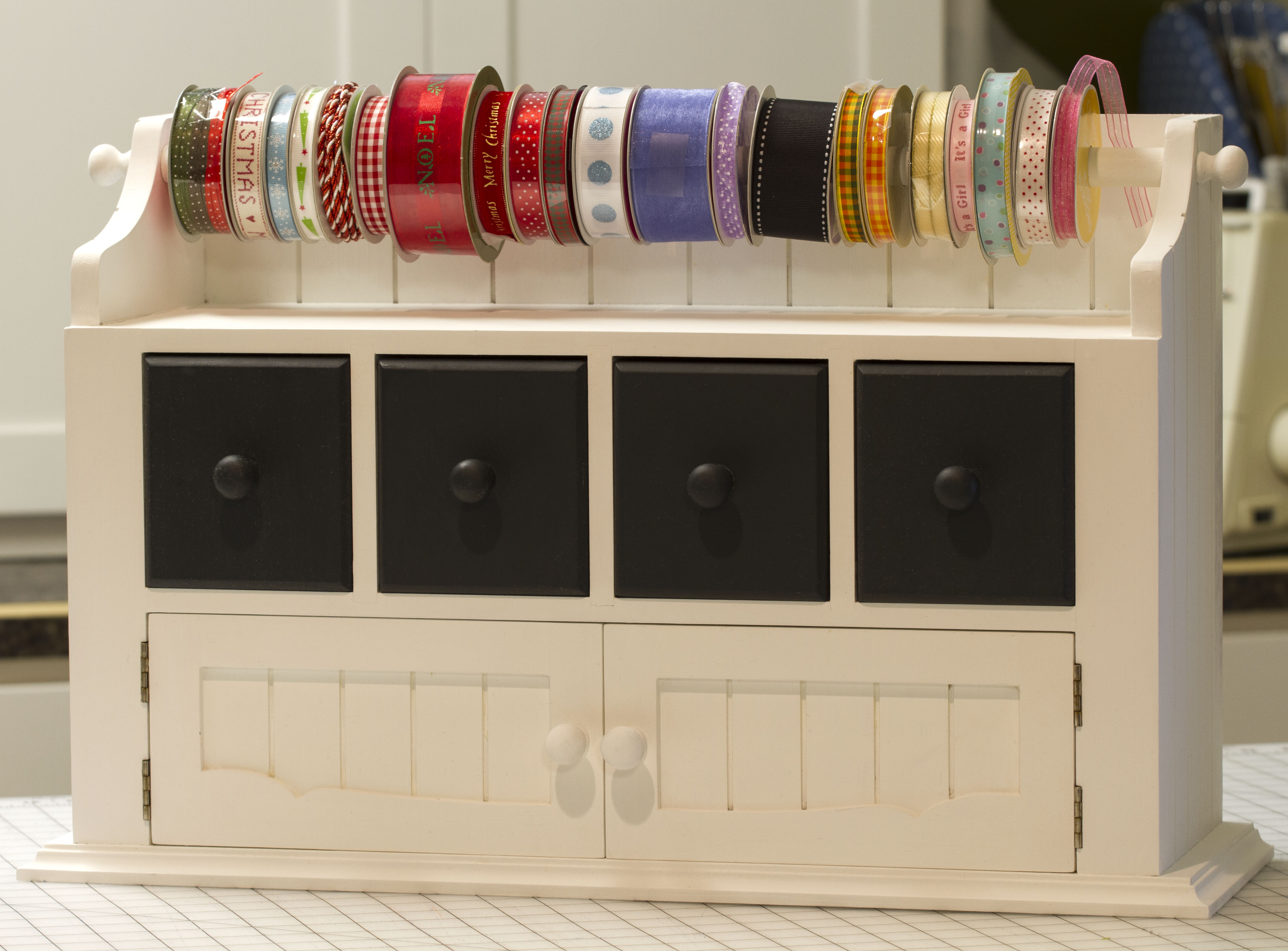 After cleaning the cabinet well, I took out the drawers and took off the doors and dowel, then painted the small drawers with charcoal gray chalk paint, and painted the rest of the cabinet with white chalk paint. I massaged clear wax onto the painted cabinet after the paint dried. It was reassembled (I wanted to turn the doors upside down but the hinges were not symmetrical so I couldn’t) and put the drawers in upside down. The dowel is perfect for ribbon spools and the cabinet organizes sewing supplies. Maybe I should stand on my head next time I want to re-purpose something, just to see if it would work better upside down.