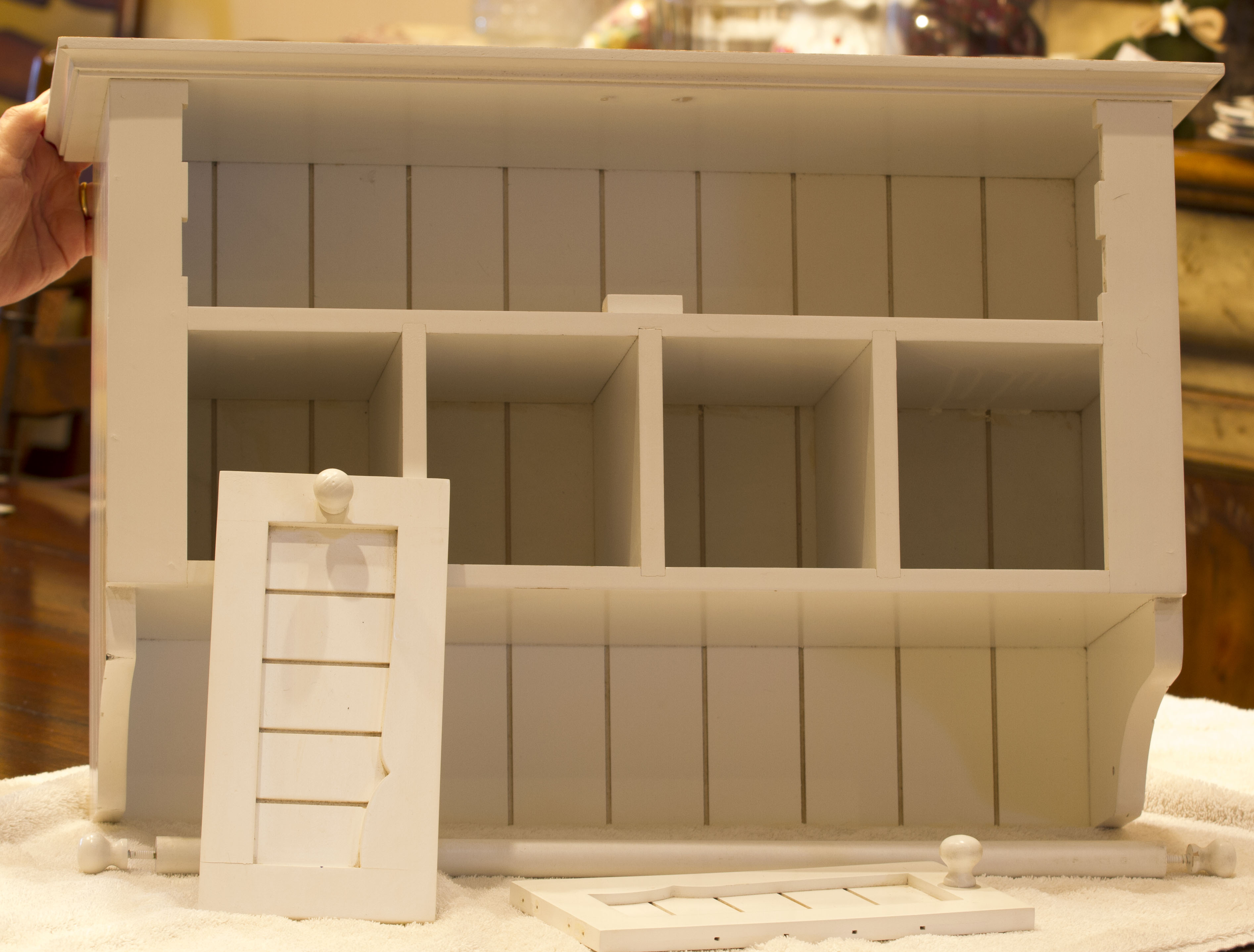 This little wall cabinet was found at a local thrift store and it needed some attention. It wasn’t in bad shape, dirty and a little scratched, but I knew I could find a use for it. I brought it in the house and laid it on its top to start cleaning it. As I walked back to the table with cleaning supplies, I realized exactly where it was going to be used, and decided it will be upside down rather than hung on a wall.