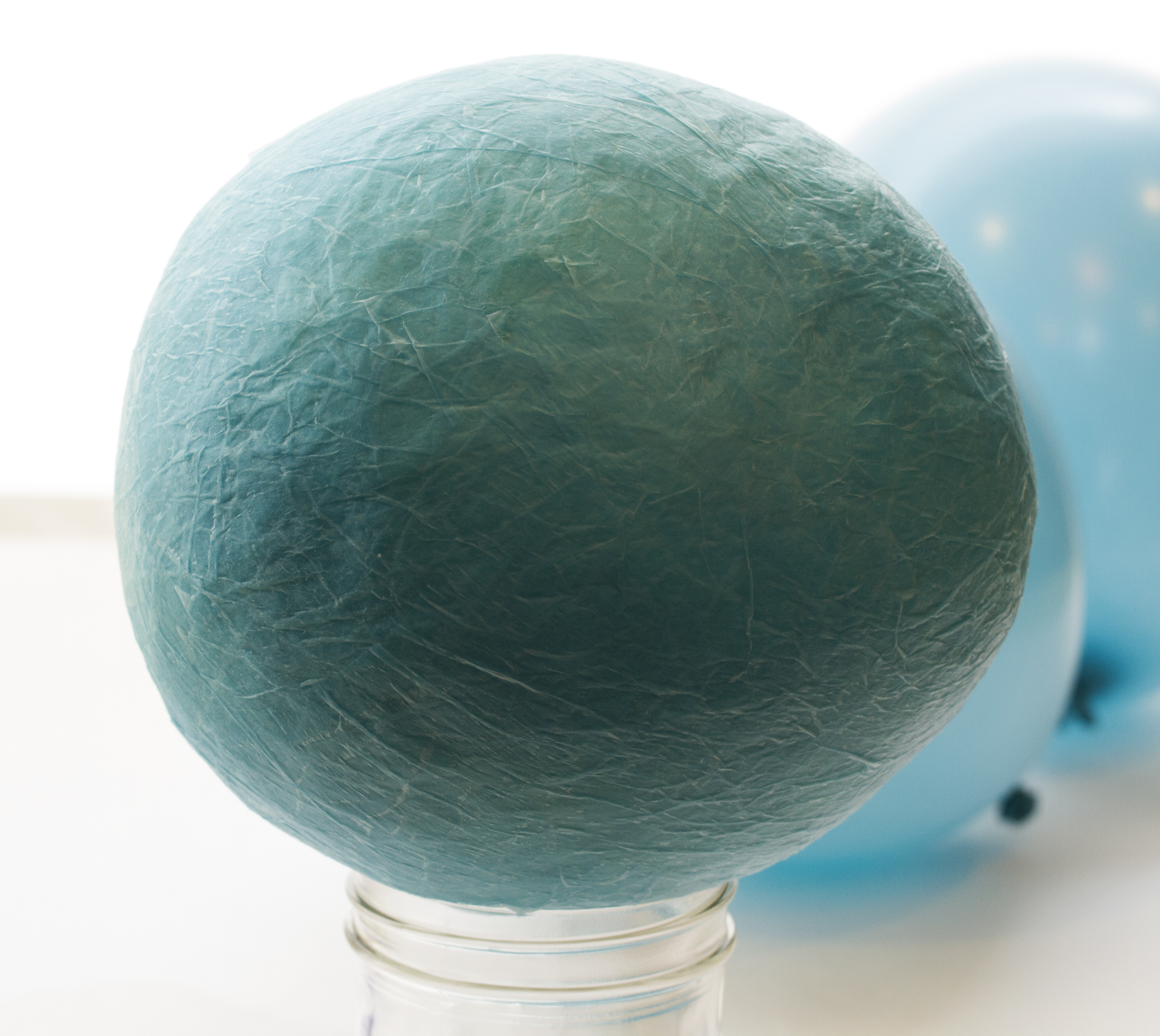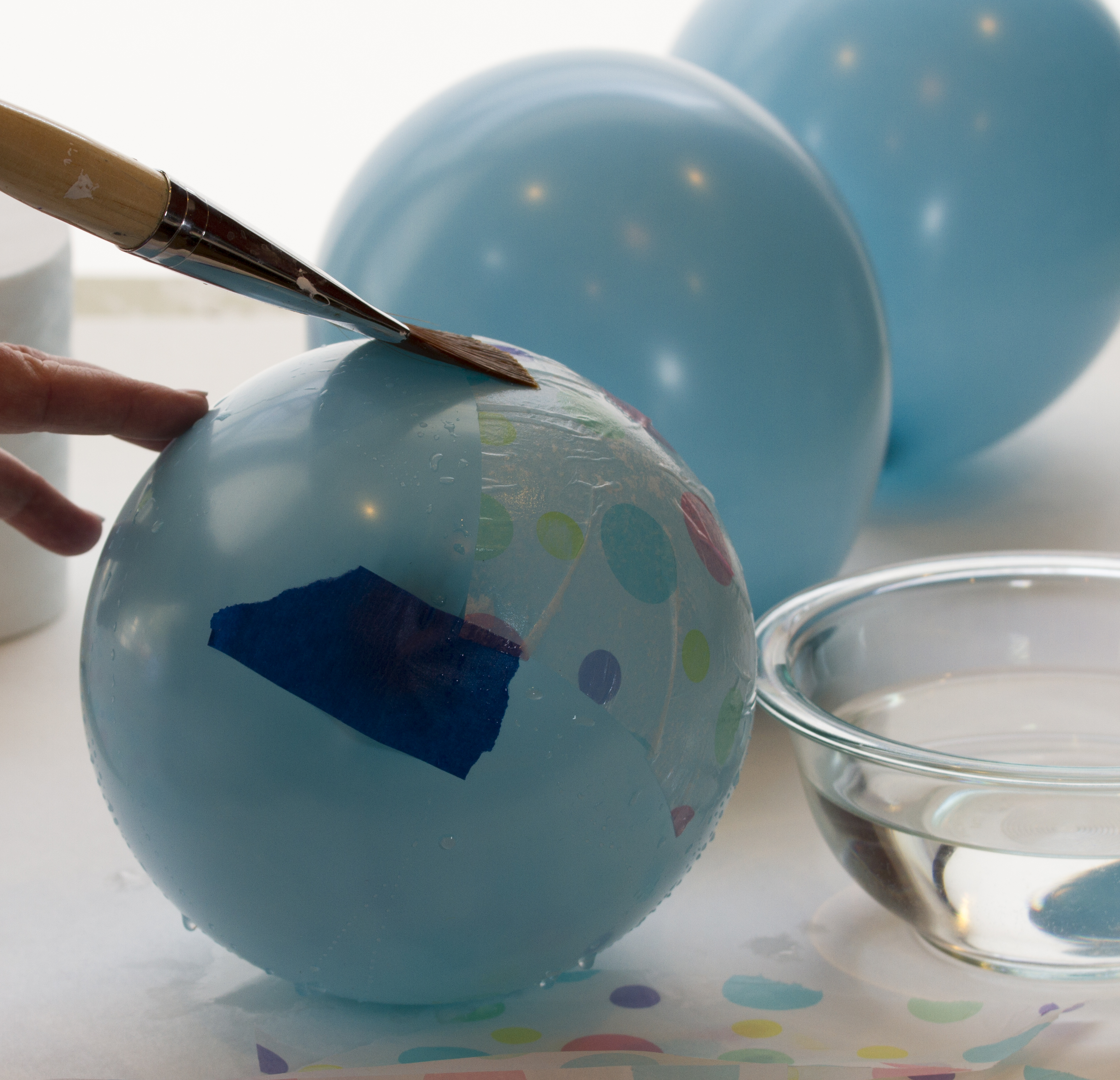 Then cover the entire balloon with the decorative tissue paper as the final layer. (I used a solid blue on the outside so I covered the balloon with several layers of blue tissue until the color was a solid color and not splotchy.) Make sure the pattern is right side out if using a pattern and brush with water/glue.