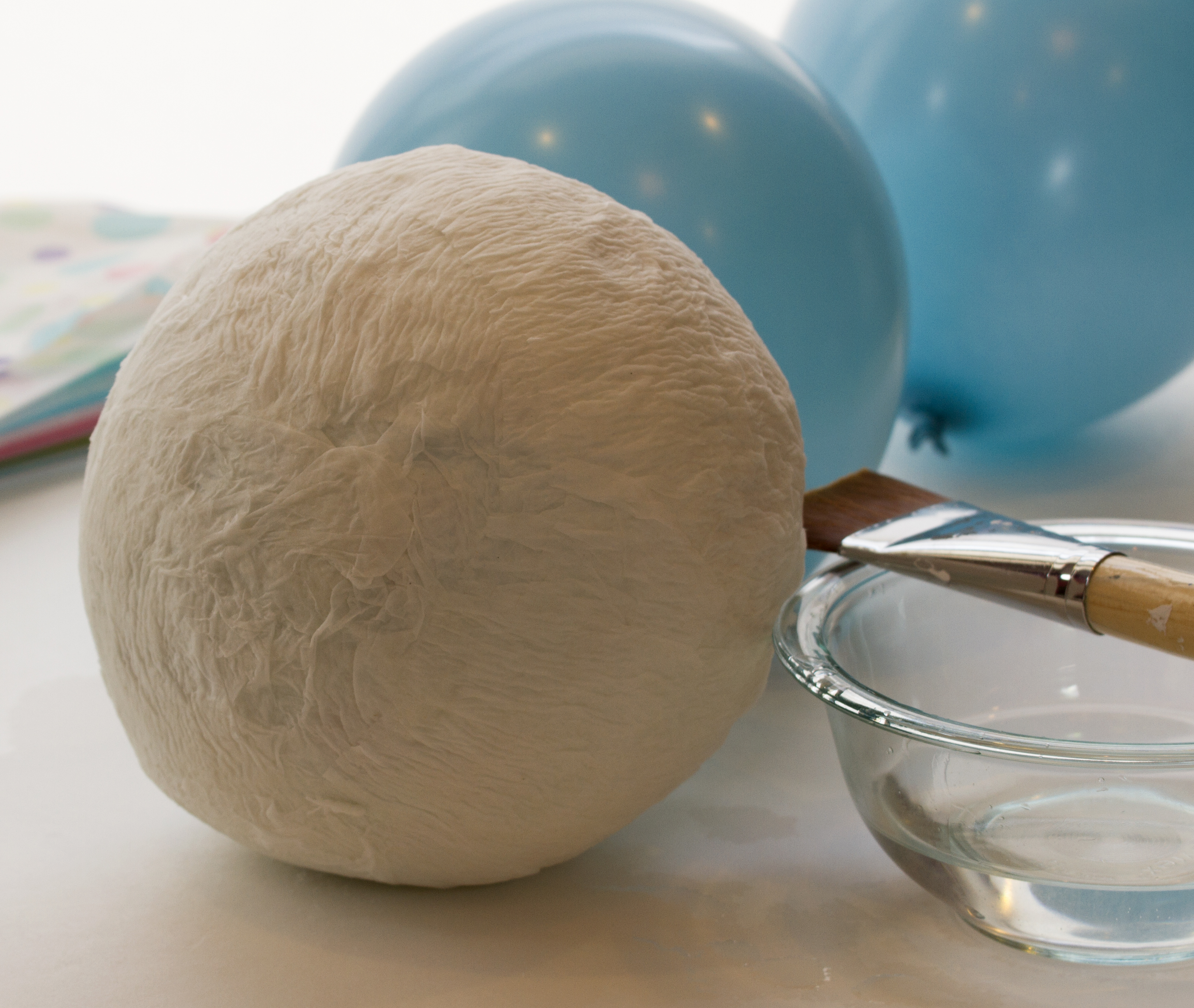 Next wrap toilet paper around the tissue covered balloon making sure to cover entire balloon. Brush with water/glue to saturate and stick the paper to the first layer of tissue paper. Cover and brush with water/glue about 4 layers of toilet paper total.