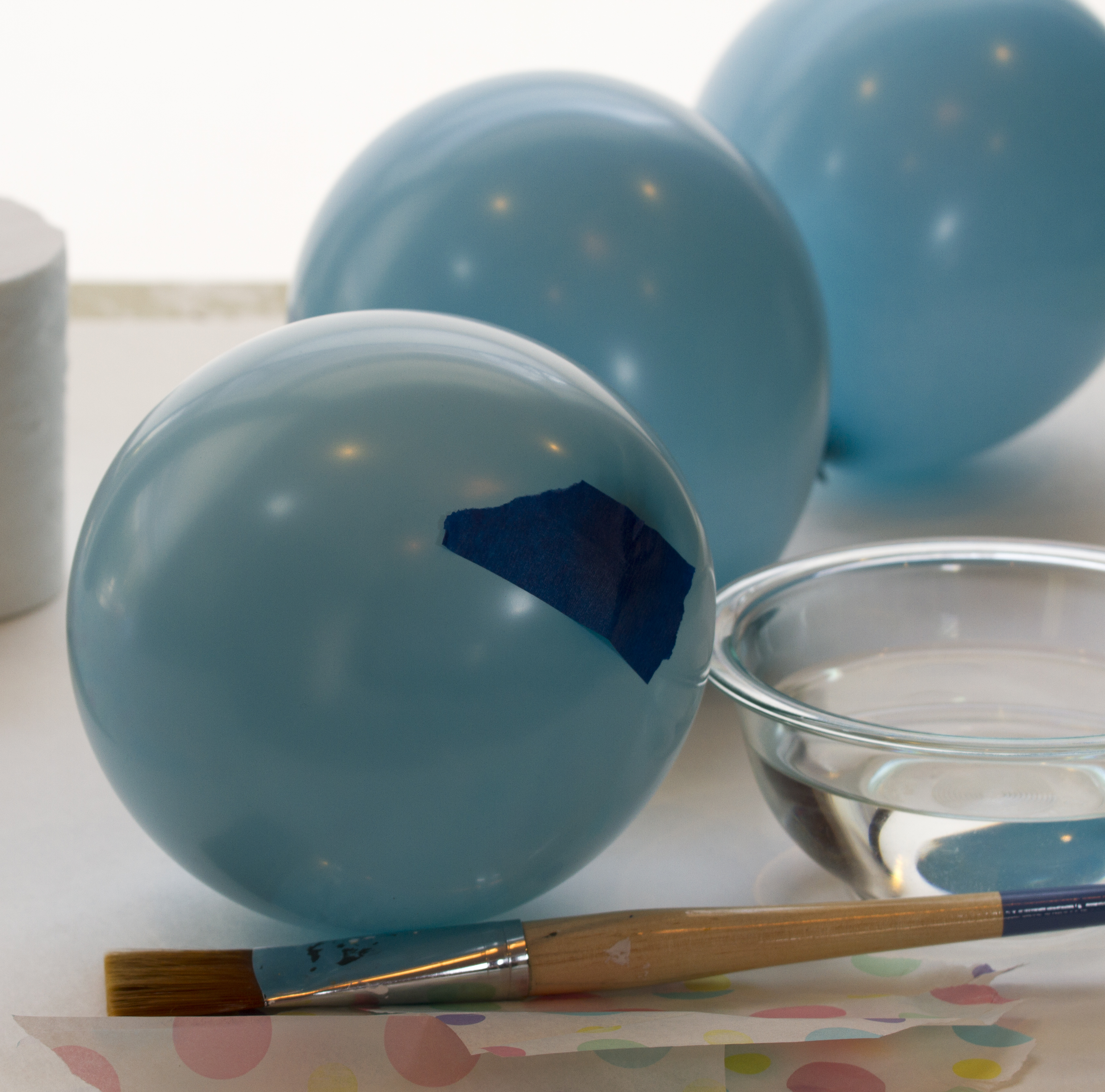 Blow up oval balloons to the size you would like your Easter egg basket to be. Tie the balloon off and put a piece of masking tape on the tied end of the balloon to flatten it. Tear tissue paper (or other choice of papers) into smaller strips about 3 to 5 inches.