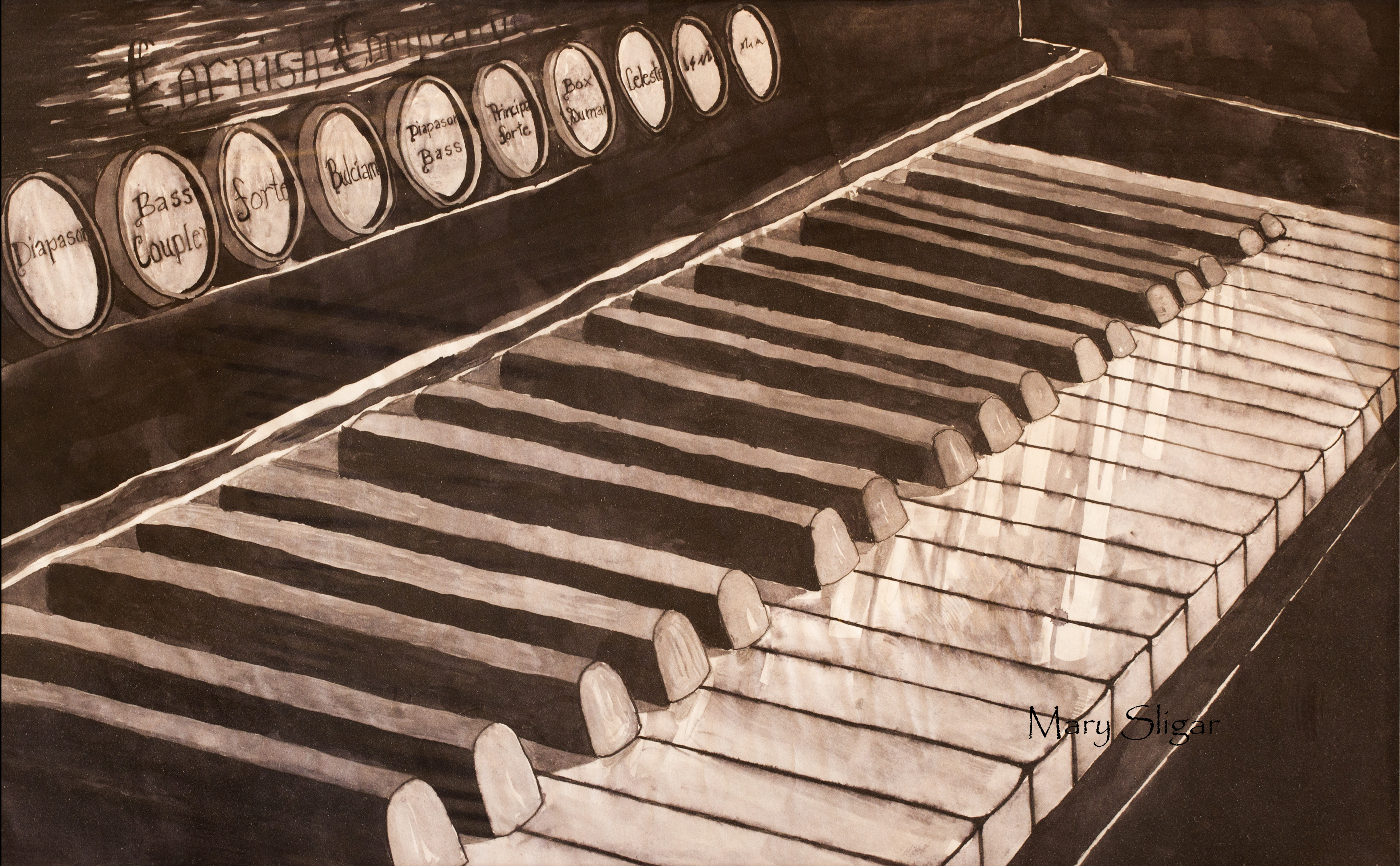 This drawing of an antique organ is made using India ink, an ink pen and brushes. I like to use different mediums and experiment with the results. I found that sketching with India ink, I get a much different result than with charcoal or pencil.