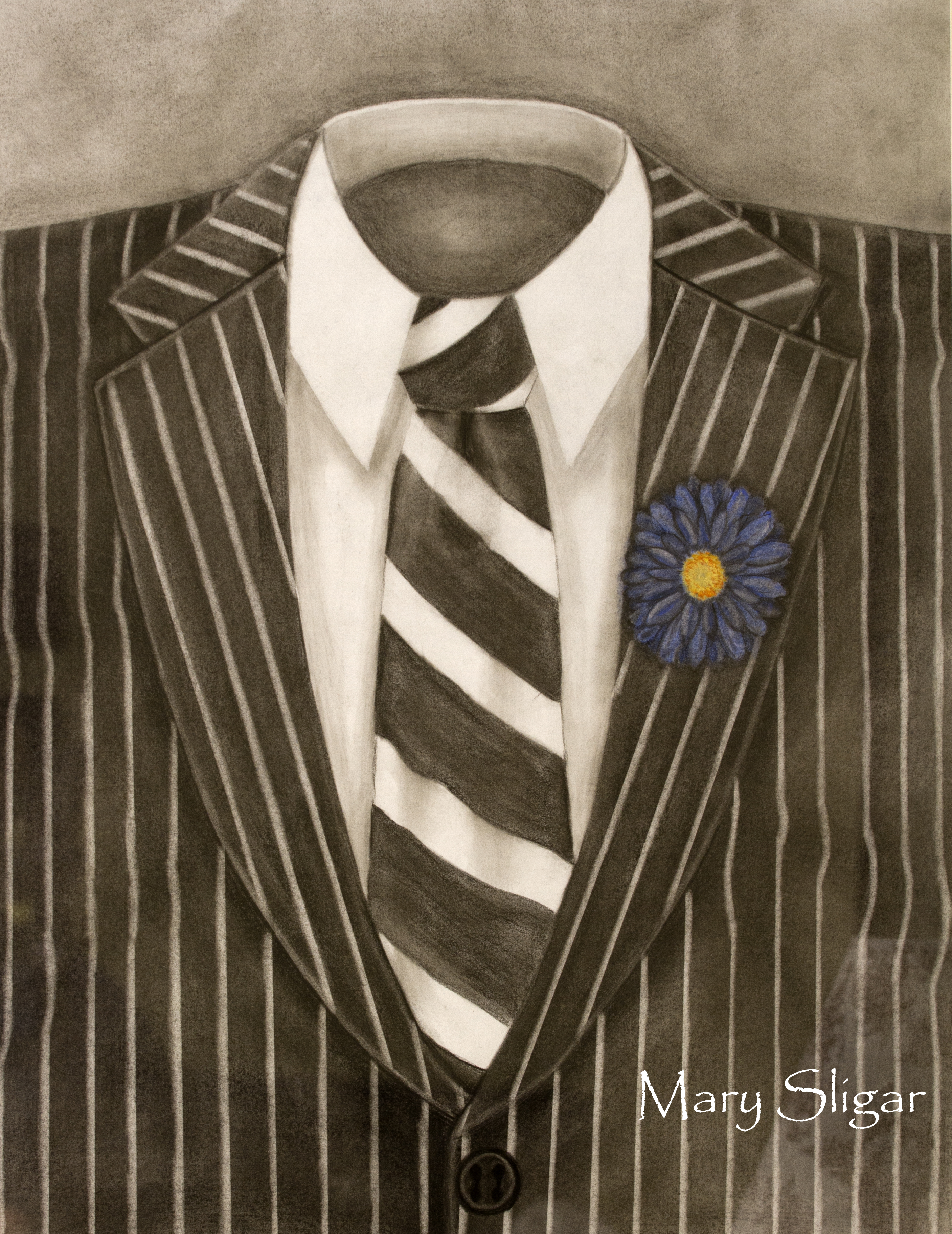 This is a drawing of my husband’s suit. (Sorry about the reflection in the lower right corner.) It is drawn with charcoal pencil. I blended the sketch and for the pin stripes I erased the lines with a sharp eraser.