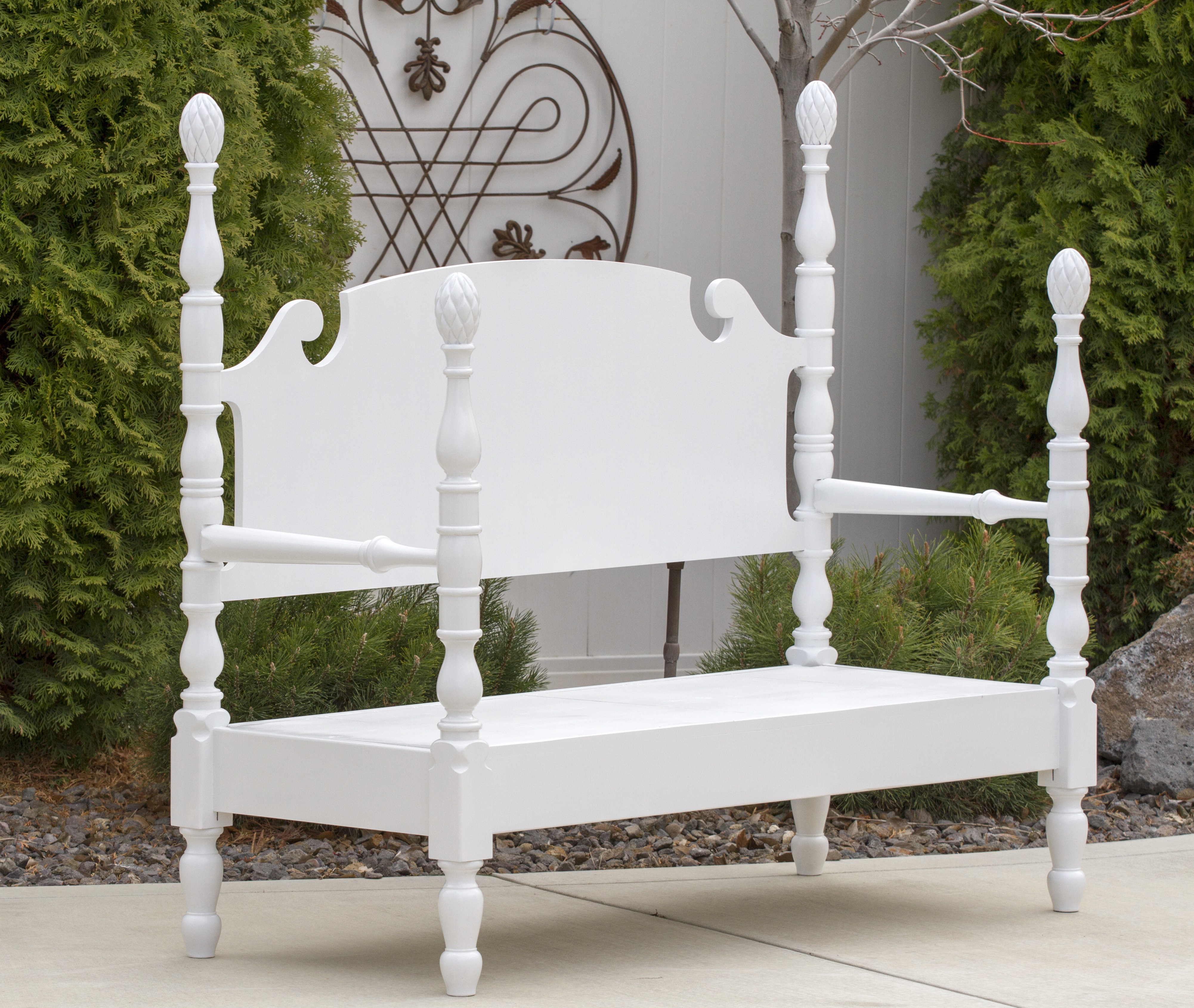 I cut the foot board to the depth I wanted the bench to be, about 24 inches. Fastening the foot board to the head-board was done by drilling through the back of the head-board and into the cut end of the foot board. I used extra long screws to assemble this part of the bench frame. I cut one of the side rails to the size needed to go between the foot board posts in front. I used the metal fasteners on each end of the side rails just as if putting the bed together. (After cutting the side rail to length I took the fastener off the unused end of the side rail and repositioned the hardware on the cut end.) Then I put on boards to make the seat using screws to secure them to the bench. Gave it a good sanding, primed, and painted.