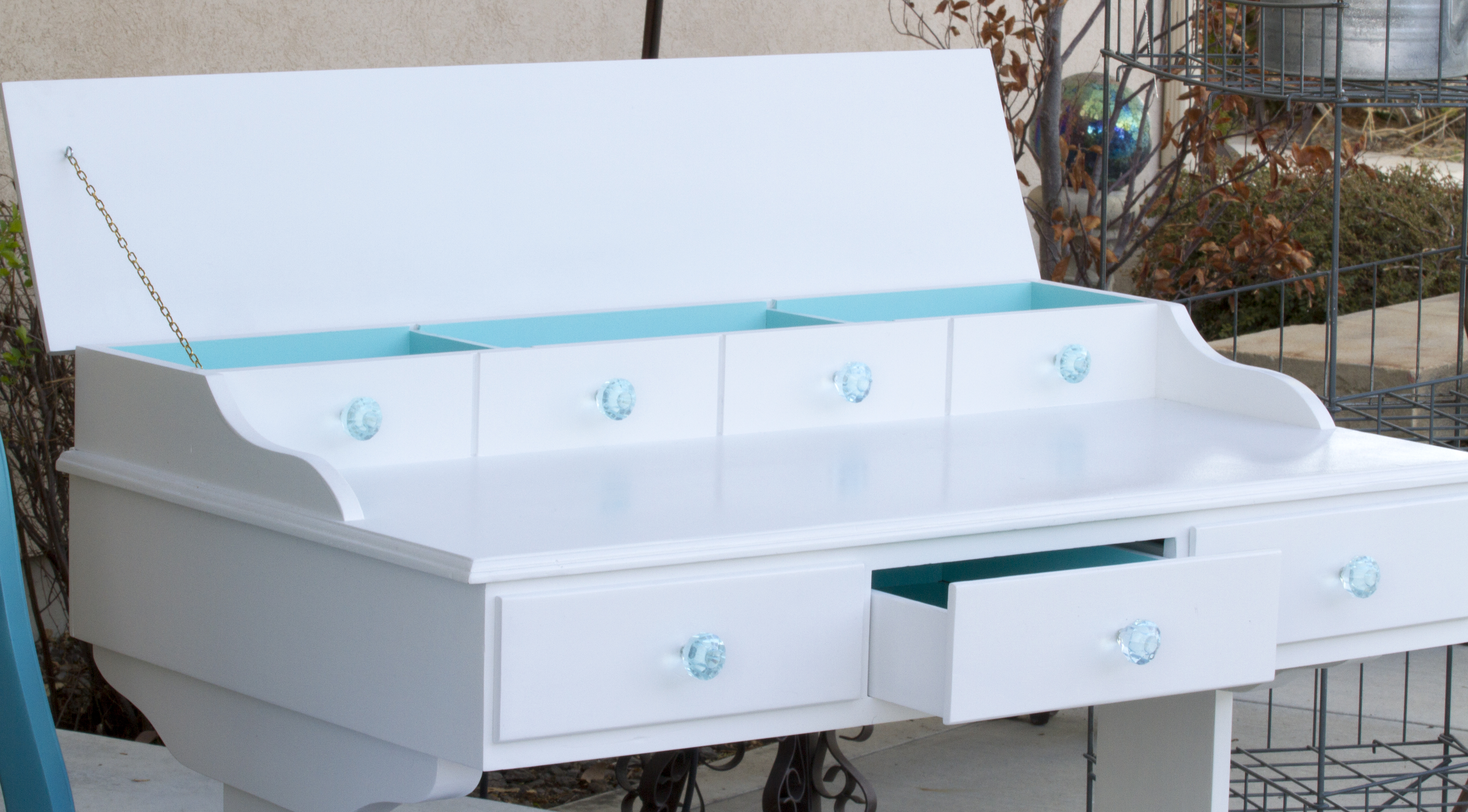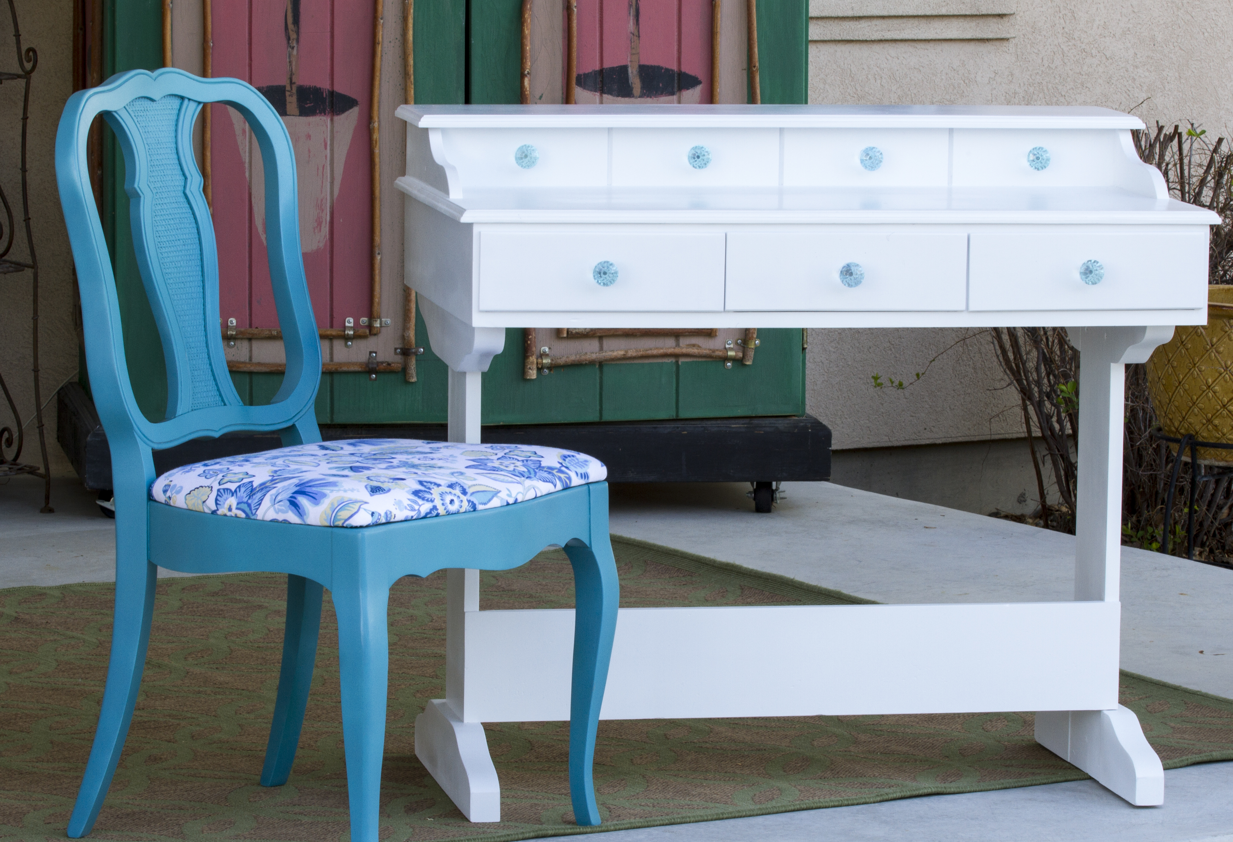 We have been sanding, painting, and fixing up stuff again. Here is the latest projects, an old desk and a Thomasville chair that needed new personalities.