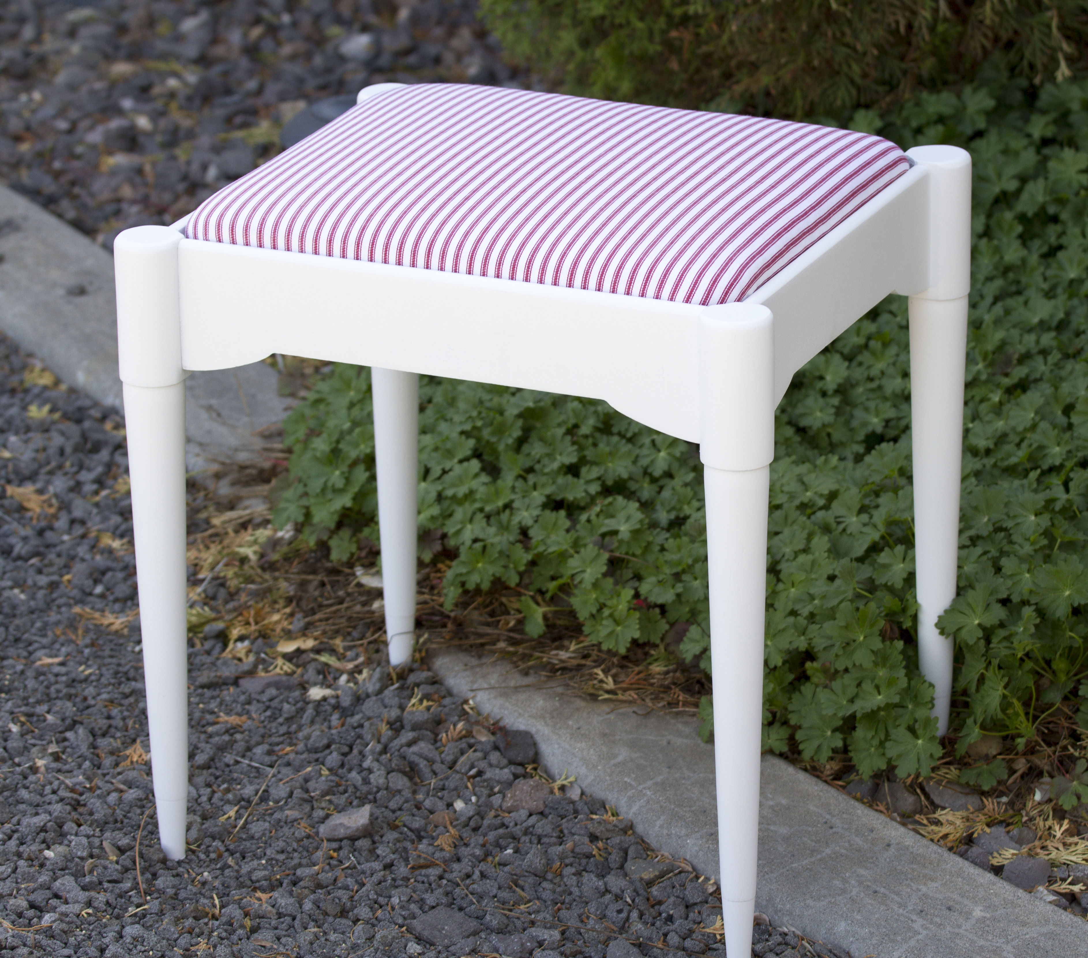 My Mr. Wonderful took the bench apart and sanded the wood. He applied metal primer on the feet after cleaning up the rust. The wood was painted with primer then white paint and he reassembled the bench. Then I upholstered the bench cushion with red mattress ticking fabric after adding more batting. Now it is clean, simple, and ready to use.