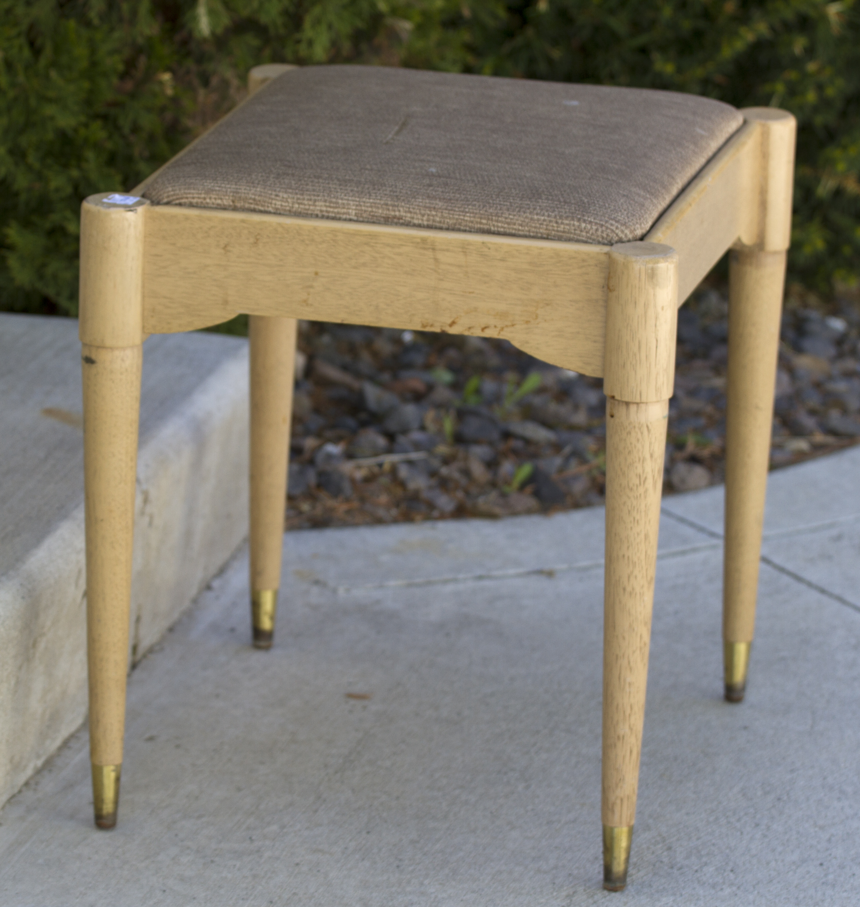 Sometimes a chair takes up too much room and this is the case in my small sewing area. I found this small bench that the cushion lifts off providing a small storage space. Bonus! You can see by the before photo that it was scratched up and had rust on the metal feet. The cushion was in the original plastic covered state and had what seemed like an iron burn on top. It was ugly, dirty, and neglected but I saw potential.