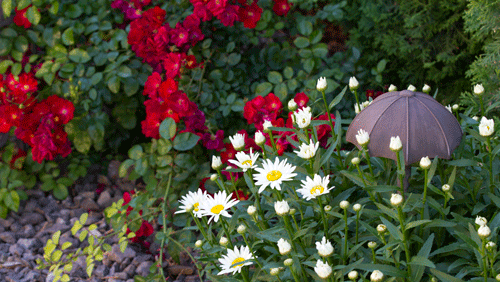 Decorating with flowers is simple and easy. You don’t need to break the bank to bring gorgeous color accents to your yard. Perennials add classic style and keep the cost reasonable as they return year after year. Roses and daisies are a few of my favorites shown here among a decorative low voltage umbrella light.
