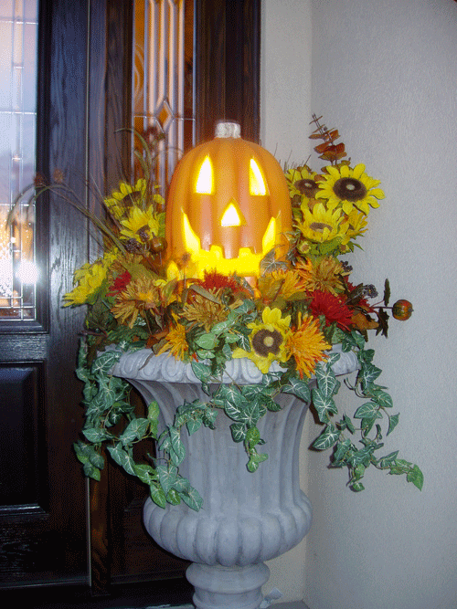 Plug in your pumpkin so that you know the light works. Place the pumpkin in the center on its raised area. (I poked two holes in the bottom to put wire picks to hold the pumpkin in place due to wind.) Build your arrangement by placing largest flowers and filling in with smaller pieces. If you are not skilled at flower arranging you could also use a large wreath the diameter of your container.